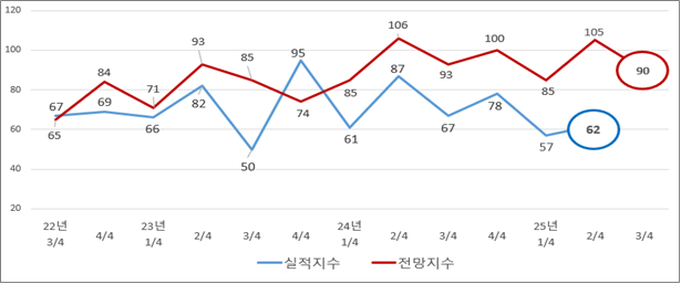 ■ 2025년 3/4분기 기업경기 전망지수(BSI; Business Survey Index) : ‘90’ ❍ 2025년 2/4분기 전망지수(105) 대비 15p 하락한 90을 기록하며, 전 분기 대비 기업들의 경기 전망이 다소 둔화될 것으로 보여짐 - 고물가, 내수 부진 등 부담 요인이 지속되고 있으며, 글로벌 경기 불확실성과 국내 수요 위축 등이 영향을 미친 것으로 판단됨 - 특히 환율, 원자재 가격 등 불안 요인과 더불어 고금리 장기화 우려가 부정적으로 작용한 것으로 보임 ■ 2025년 2/4분기 기업경기 실적지수 : ‘62’ ❍ 2025년 1/4분기 실적지수(57) 대비 5p 상승하였으나, 여전히 기준치(100)에 크게 미치지 못해 체감경기는 낮은 수준에 머무른 것으로 분석됨 - 물가와 금리 부담, 원자재 가격 상승 등 복합적 악재로 인해 기업들의 체감 실적 개선은 미미한 수준에 그친 것으로 나타남
