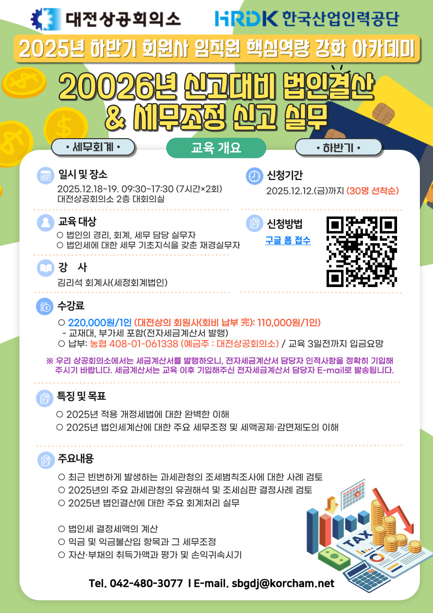 교육 일시 : 2025년 12월 18~19일 09:30~17:30 *내용이 2일간 이어지는 교육입니다. 교육 과정 : 2026 신고대비 법인결산과 세무조정 신고실무 교육 장소 : 대전상공회의소 2층 대회의실 교육비 : 회원사 110,000원 / 비회원사 220,000원 *교재비(9만원), 중식 포함 농협 408-01-061338(예금주 : 대전상공회의소) *교육 시작 3일 전까지 입금 요망 접수 방법 : 구글폼 접수 (https://forms.gle/XVHr8TZHcCi5a5mC6) *한국산업인력공단 과정 혼합 운영으로 별도 개인정보 수취 예정