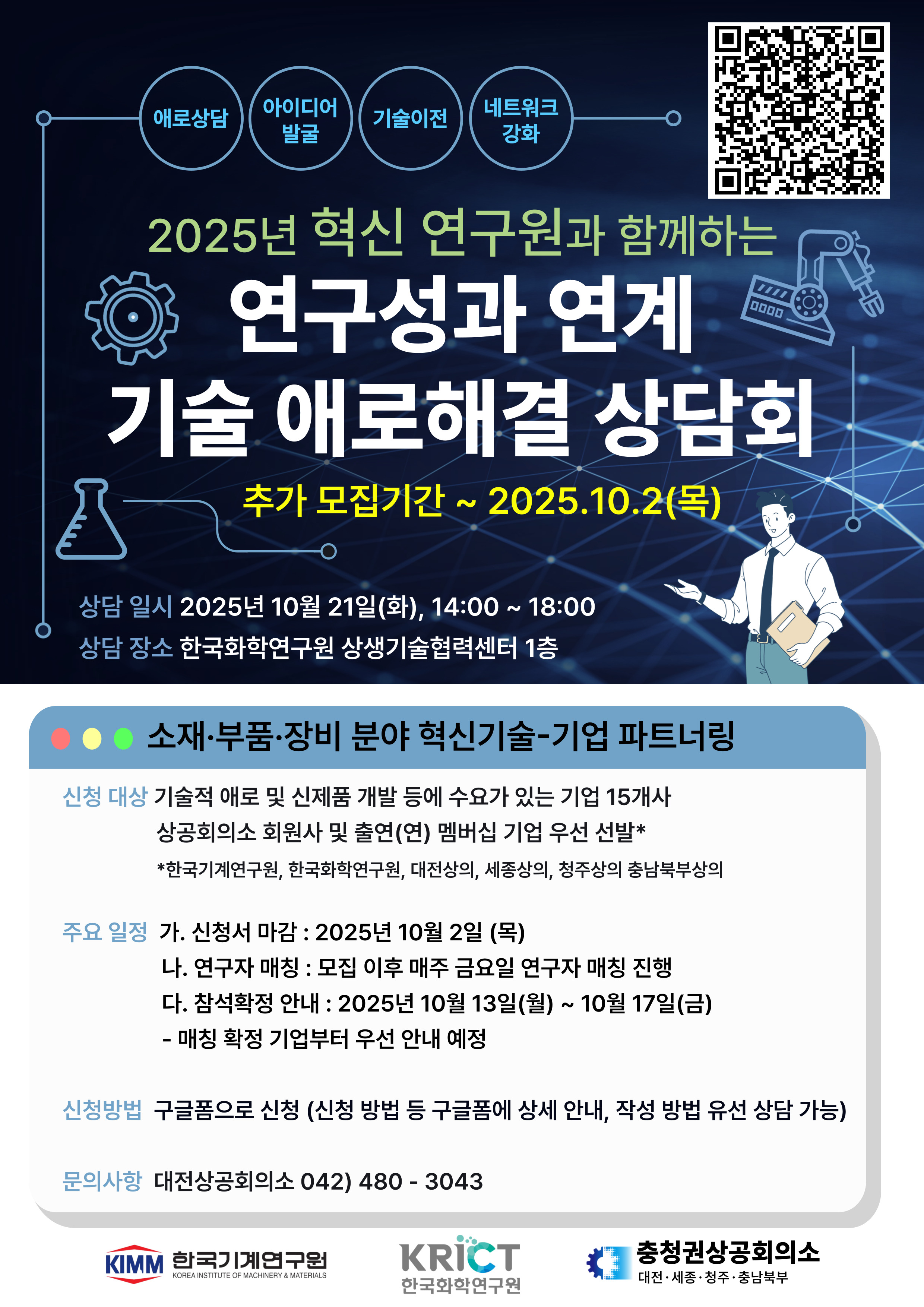 ■ 상담회 개최 : 2025년 10월 21일(화) 14:00 ■ 상담회 장소 : 한국화학연구원 상생기술협력센터