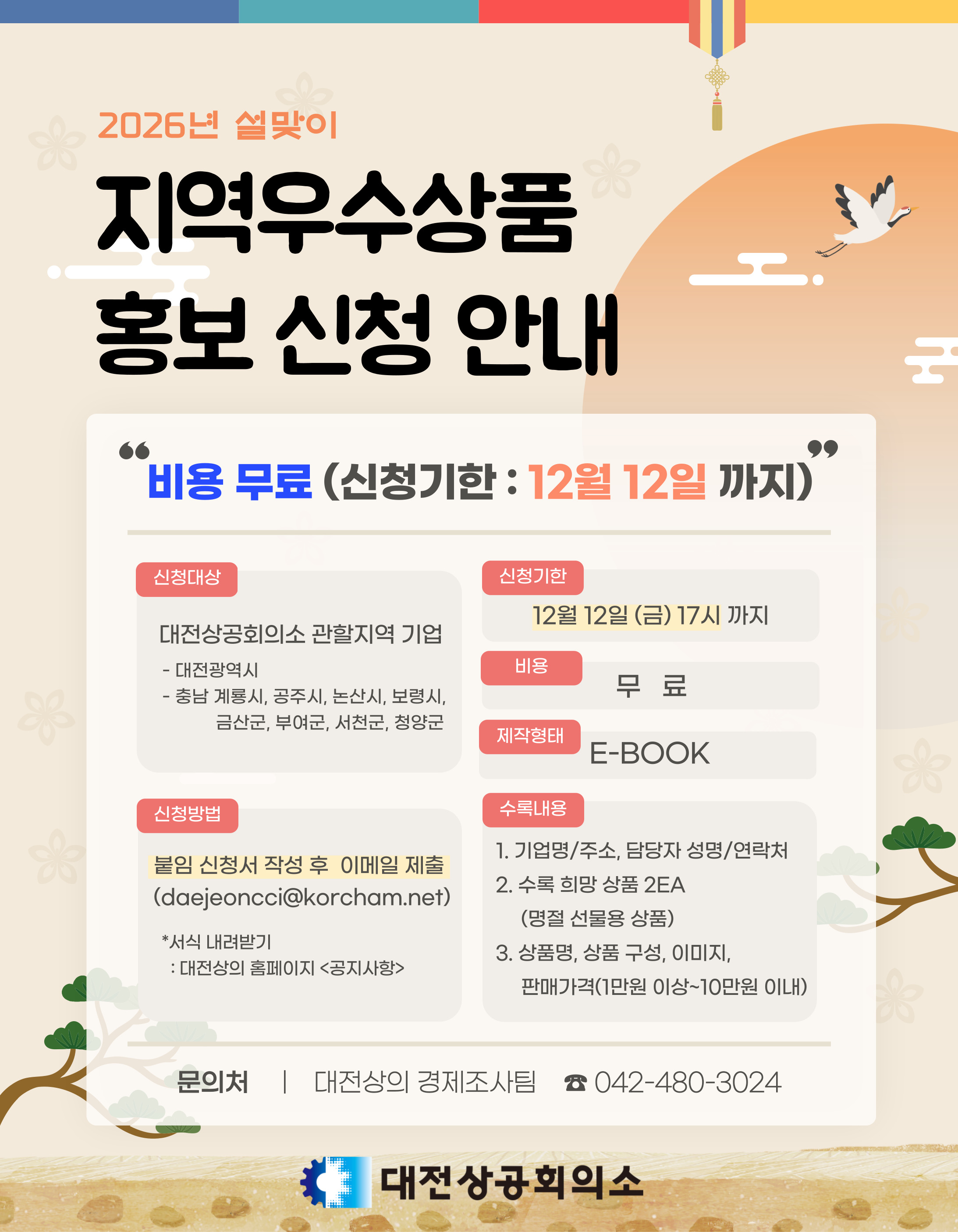 1. 목 적 : 선물용 지역우수상품 홍보 및 판로 지원 2. 신청기한 : 12. 12.(금) 17:00까지 3. 신청대상 : 본 회의소 관할지역* 기업 *대전광역시 전역 *충남 계룡시, 공주시, 논산시, 보령시, 금산군, 부여군, 서천군, 청양군 4. 수록내용(필수 항목) 1) 기업명, 담당자 성명, 연락처, 기업 주소 2) 수록 희망 상품 2EA(명절 선물용 상품) 3) 각 상품명, 상품 구성, 이미지, 판매가격(1만원 ~ 10만원) 5. 비 용 : 무료 6. 유의사항 : 신선식품 등 배송 중 변질 우려 상품 제외 7. 신청방법 : 붙임 신청서 작성 후, 이메일(daejeoncci@korcham.net) 송부 8. 문 의 : 대전상공회의소 경제조사팀 (☎)042-480-3024