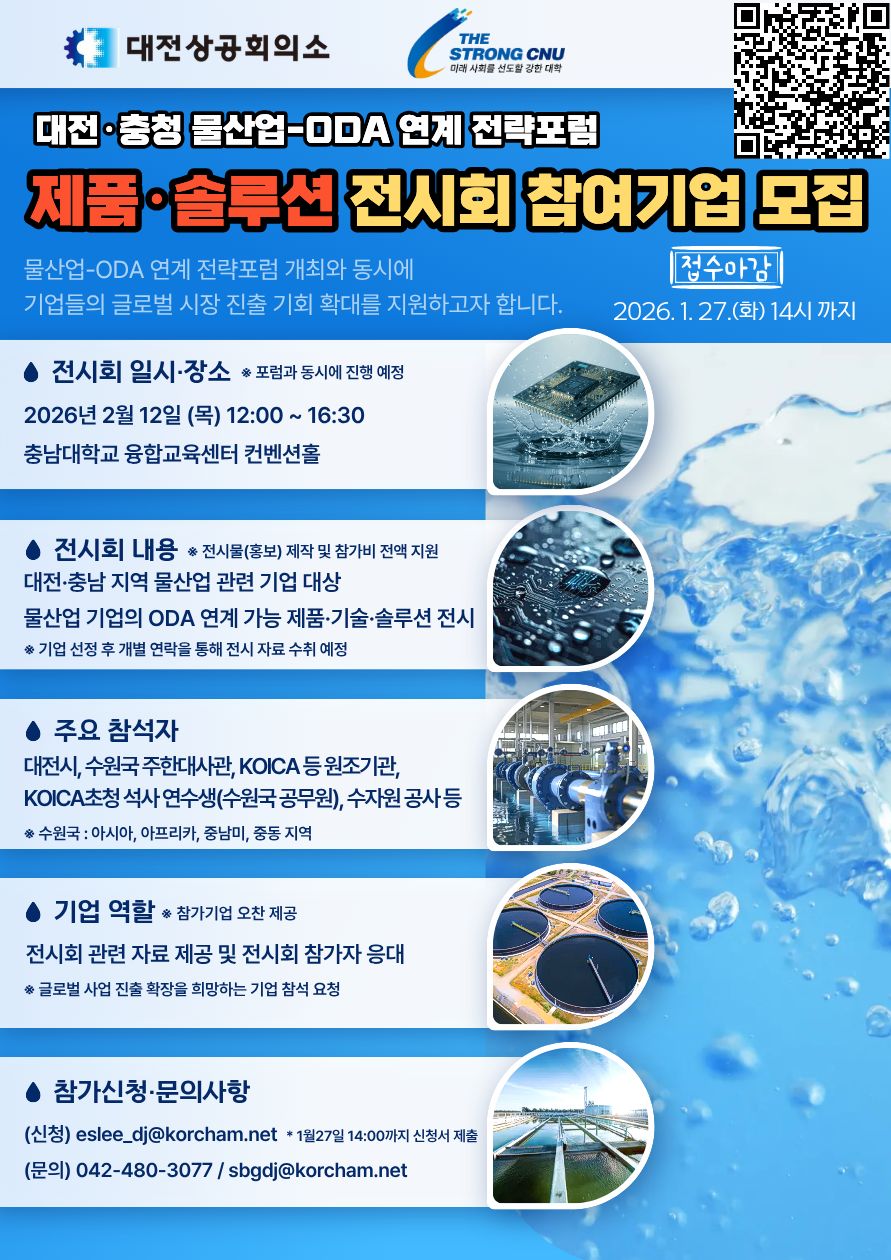 안녕하세요. 대전상공회의소 사무국에서 안내합니다. 본 상공회의소에서는 충남대학교와 함께 기업들의 글로벌 시장 진출 기회 확대를 지원하고자 물산업-ODA 연계 전략 포럼을 개최합니다.