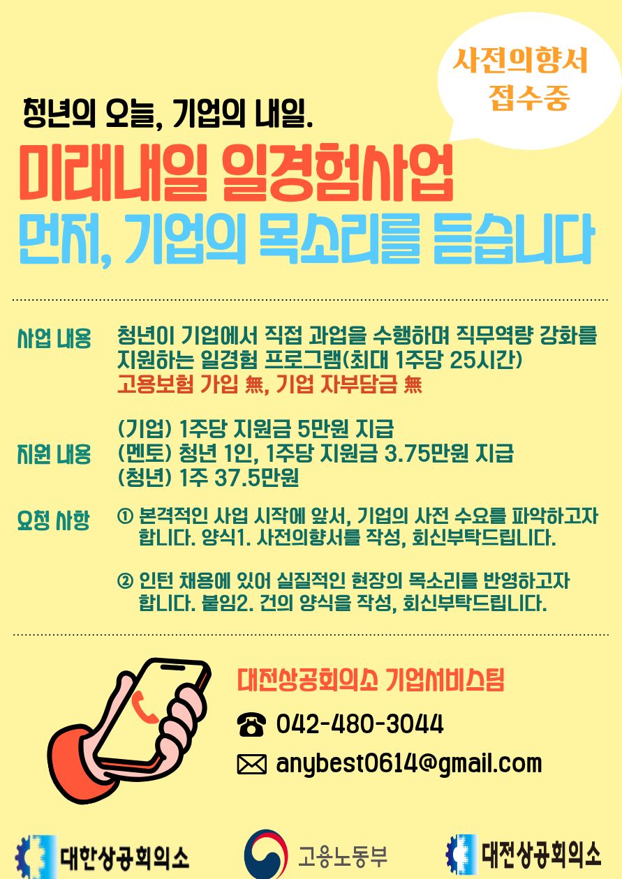 대전상공회의소에서 안내드립니다. 대전상공회의소에서는 지역 기업·기관의 원활한 인력채용을, 일경험이 부족한 지역 청년에게는 다양한 양질의 일경험 기회를 제공하는 '미래내일 일경험 사업'을 수행하고자 합니다.