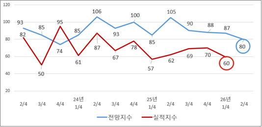 한편, 2026년 1/4분기 기업경기 실적지수는 ‘60’으로 조사되어 전분기(70) 대비 10p 하락하였다. 이는 고금리 기조에 따른 자금 조달 여건 악화와 내수 소비 위축이 실제 경영 실적에 직접적인 하락 압력으로 작용한 결과로 풀이된다.