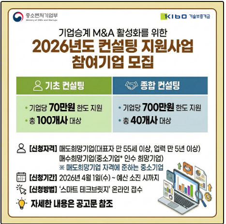 기술보증기금에서는 실시하고 있는 「2026년도 기업승계 M&A 컨설팅 지원사업」 을 안내합니다. <매도 및 매수 희망 기업 모두 지원>