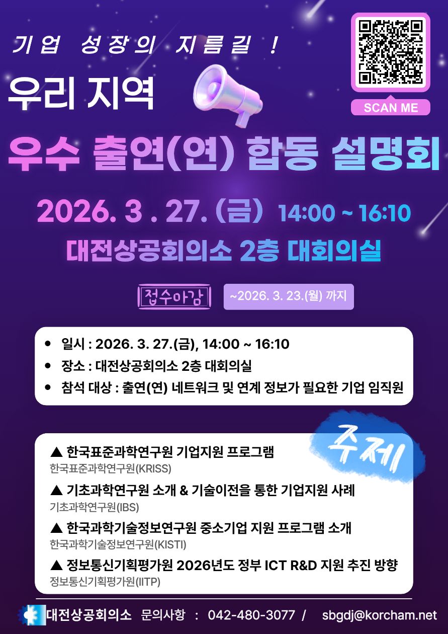 1. 일시 : 2026.03.27.(금) 14:00~16:00 2. 장소 : 대전상공회의소 2층 대회의실 3. 대상 : 출연(연) 네트워크 및 연계 정보가 필요한 기업 임직원 4. 발표 : 기초과학연구원(IBS), 정보통신기획평가원(IITP), 한국과학기술정보연구원(KISTI), 한국표준과학연구원(KRISS) 5. 내용 : 출연(연) 소개 및 기업과 연계 가능한 정보 안내 *안내문 참고 6. 신청 : 홈페이지 신청(하단 신청 버튼) 7. 비용 : 무료 8. 기한 : 2026.03.23.(월) 까지 9. 문의 : 042-480-3077 / sbgdj@korcham.net