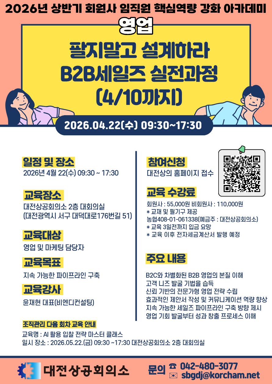 | 제목 | (핵심역량) 팔지말고 설계하라 – B2B세일즈 실전과정 교육 개최 안내(4/15 접수마감) | ||