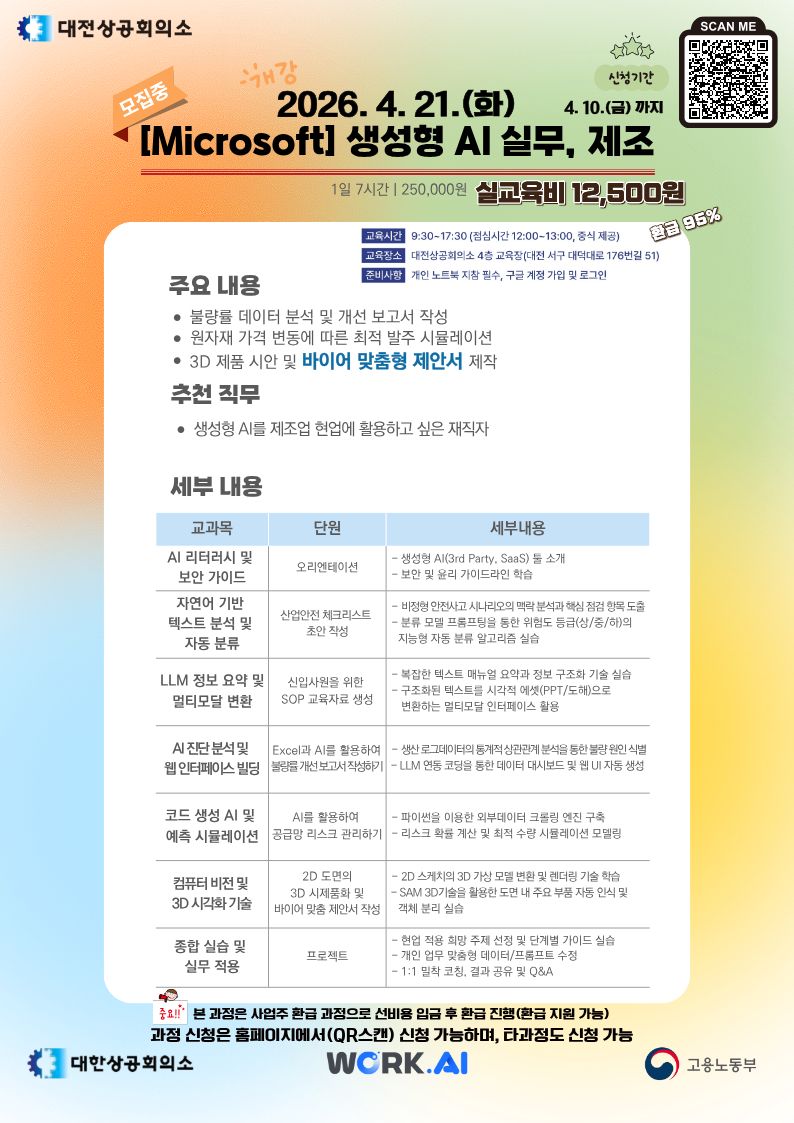 1. 교육명 : 생성형 AI 실무 제조 2. 일시 : 26.4.21.(화) 09:30~17:30 3. 장소 : 대전상공회의소 4층 중회의실 4. 비용 : 실교육비 12,500원(250,000원 선입금, 수료 후 95% 환급) ※신용카드, 계좌이체, 무통장 입금 결제 가능 5. 준비물 : 노트북 및 AI 활용을 위한 구글 계정 6. 접수 : 대전상공회의소 Work.AI 플랫폼 신청 7. 문의 : 042-480-3077 / sbgdj@korcham.net ※기업맞춤 개별 교육 문의(042-480-3043)