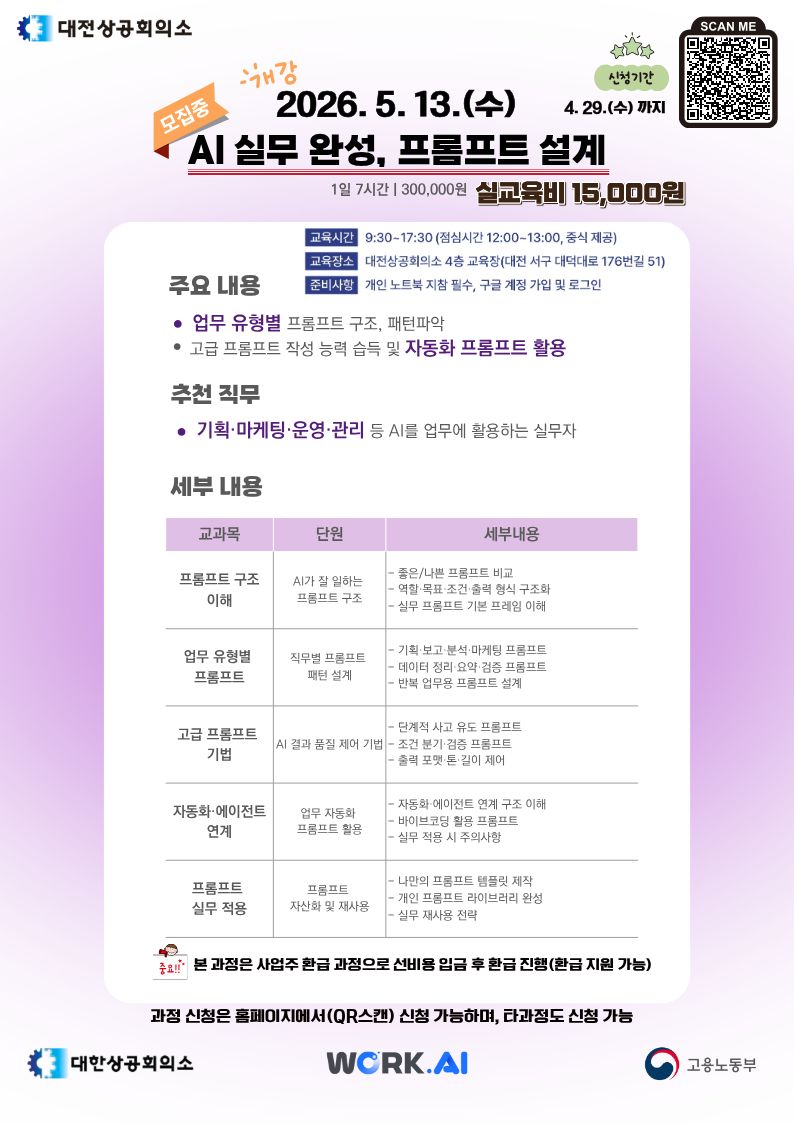 1. 교육명 : AI 실무 완성 프롬프트 설계 2. 일시 : 26.5.13.(수) 09:30~17:30 3. 장소 : 대전상공회의소 4층 중회의실 4. 비용 : 실교육비 15,000원(300,000원 선입금, 수료 후 95% 환급) ※신용카드, 계좌이체, 무통장 입금 결제 가능 5. 준비물 : 노트북 및 AI 활용을 위한 구글 계정 6. 접수 : 대전상공회의소 Work.AI 플랫폼 신청 7. 문의 : 042-480-3077 / sbgdj@korcham.net ※기업맞춤 개별 교육 문의(042-480-3043)